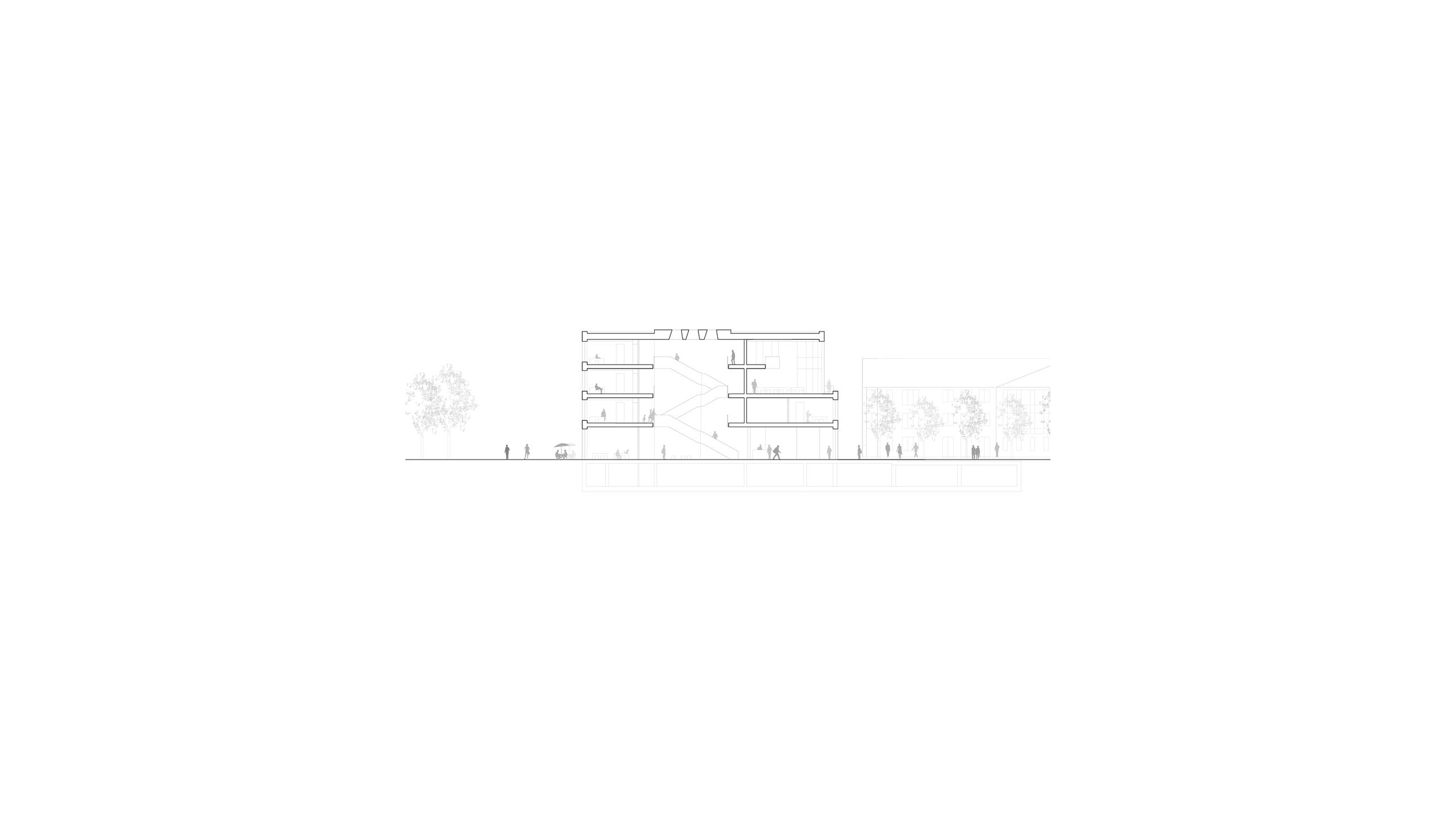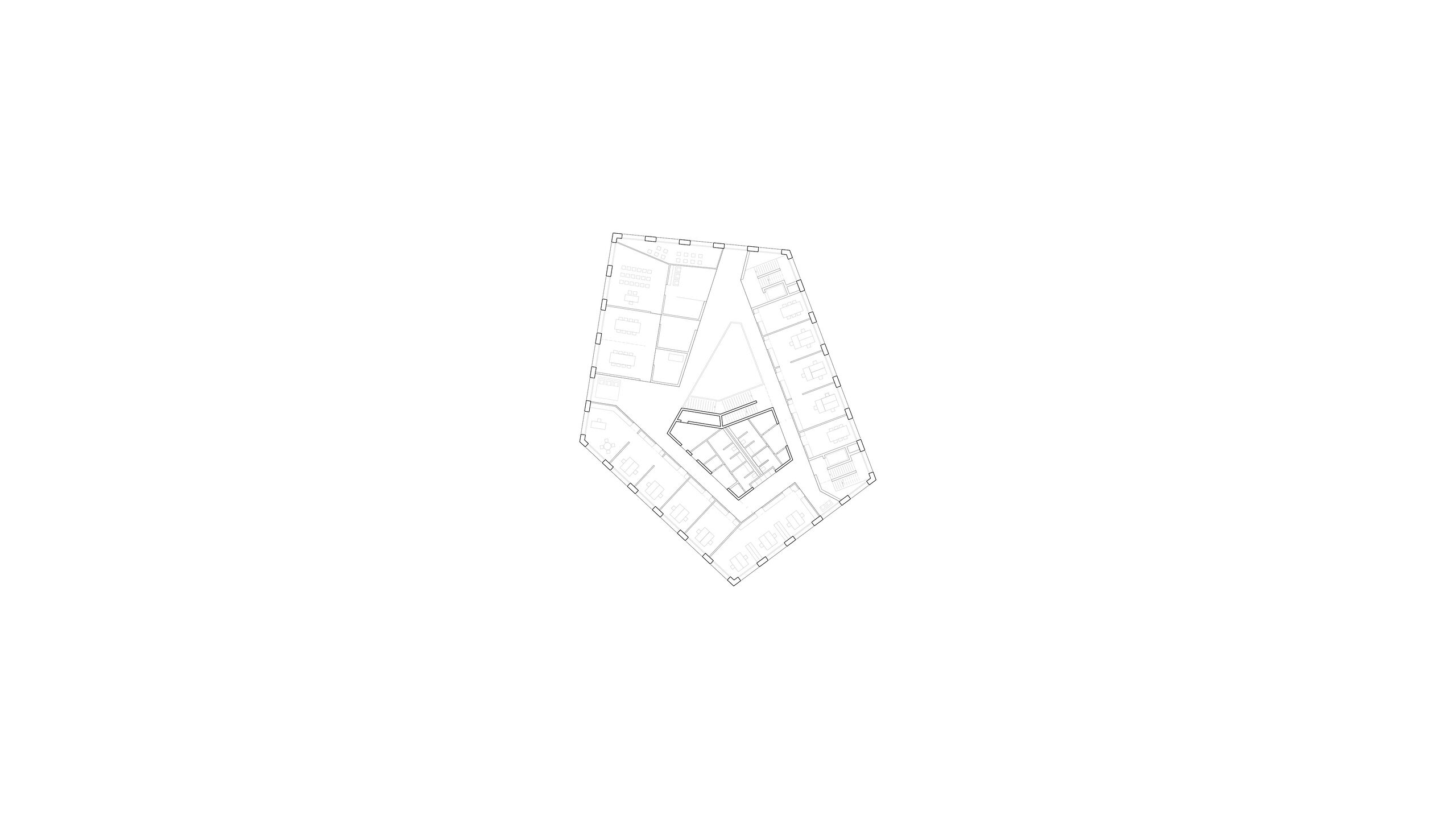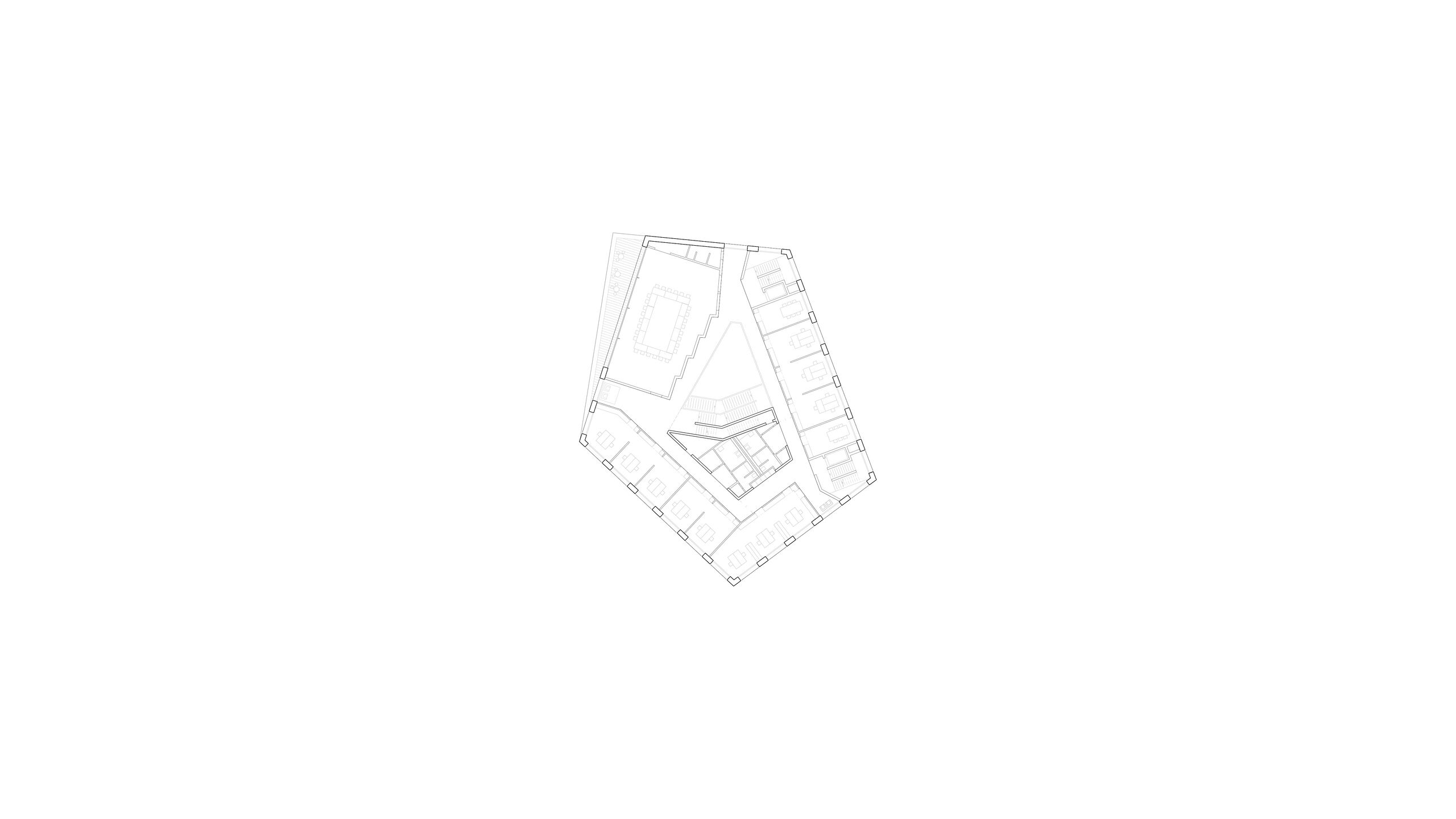In order to sustainably improve this situation and establish clear edges to the public space, the building was designed as a honed, pentagonal urban element that has no rear sides and shows its architectural presence both to the newly designed market square and to the two street fronts.